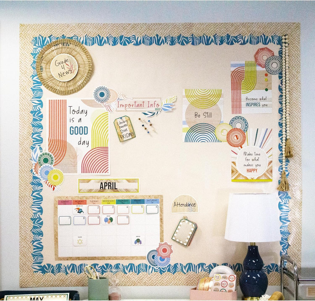Ideal for bulletin board, white board, cork board, and other displays, the boho neutral bulletin board borders are printed on thick but flexible paper that can be cut and layered to add dimension to any display. The bulletin board borders set includes 13 strips of 3’ x 3” scalloped border trim for a total of 39 feet of bulletin board border. Each border strip features a woven bamboo design to add the perfect finishing touch to boho décor in and out of the classroom.