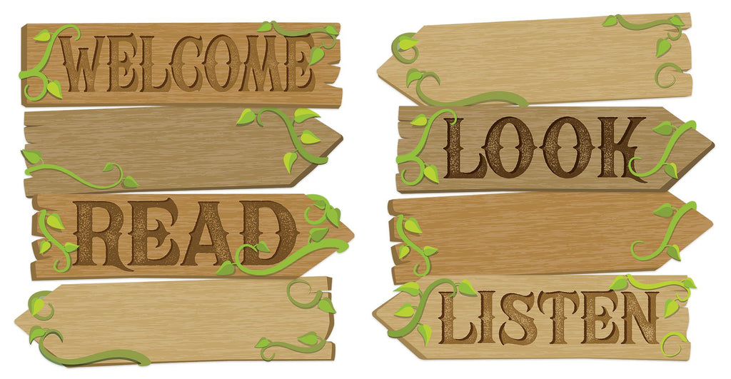 Eureka Mini Bulletin Board Sets are a great way to add creativity to bulletin boards, hallways, walls and classroom space with fun designs and themes. 8 Piece Set Includes 8 Panels With: 4 Signs Saying "Welcome, Look, Read, and Listen" and 4 Customizable Signs.