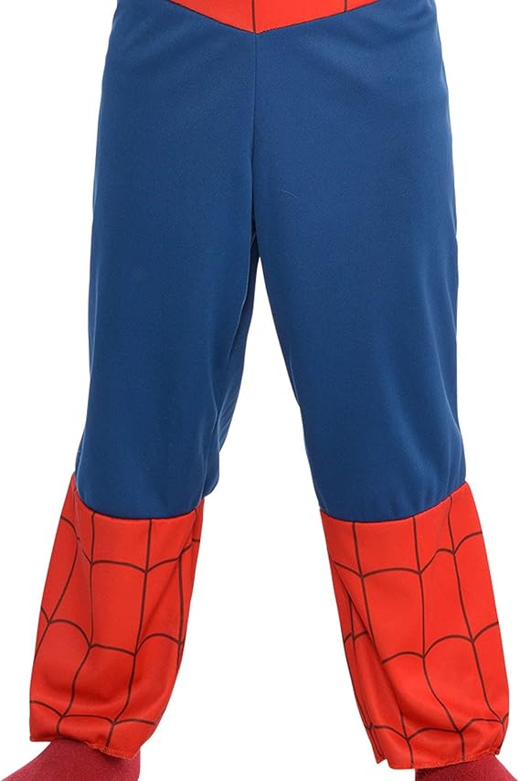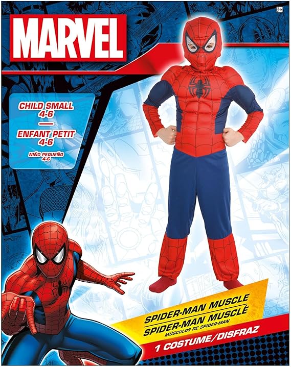 This Spider-Man costume is from children size small 4-6. The package includes muscle bodysuit and hooded face mask.