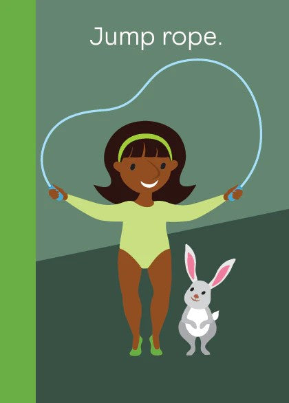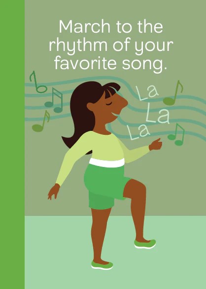 The deck includes small body movements, like flexing and pointing feet, or rolling your shoulders, big body movements like skipping or riding a scooter. There are some strategies that work outside, some that work inside, and some that work in both locations.