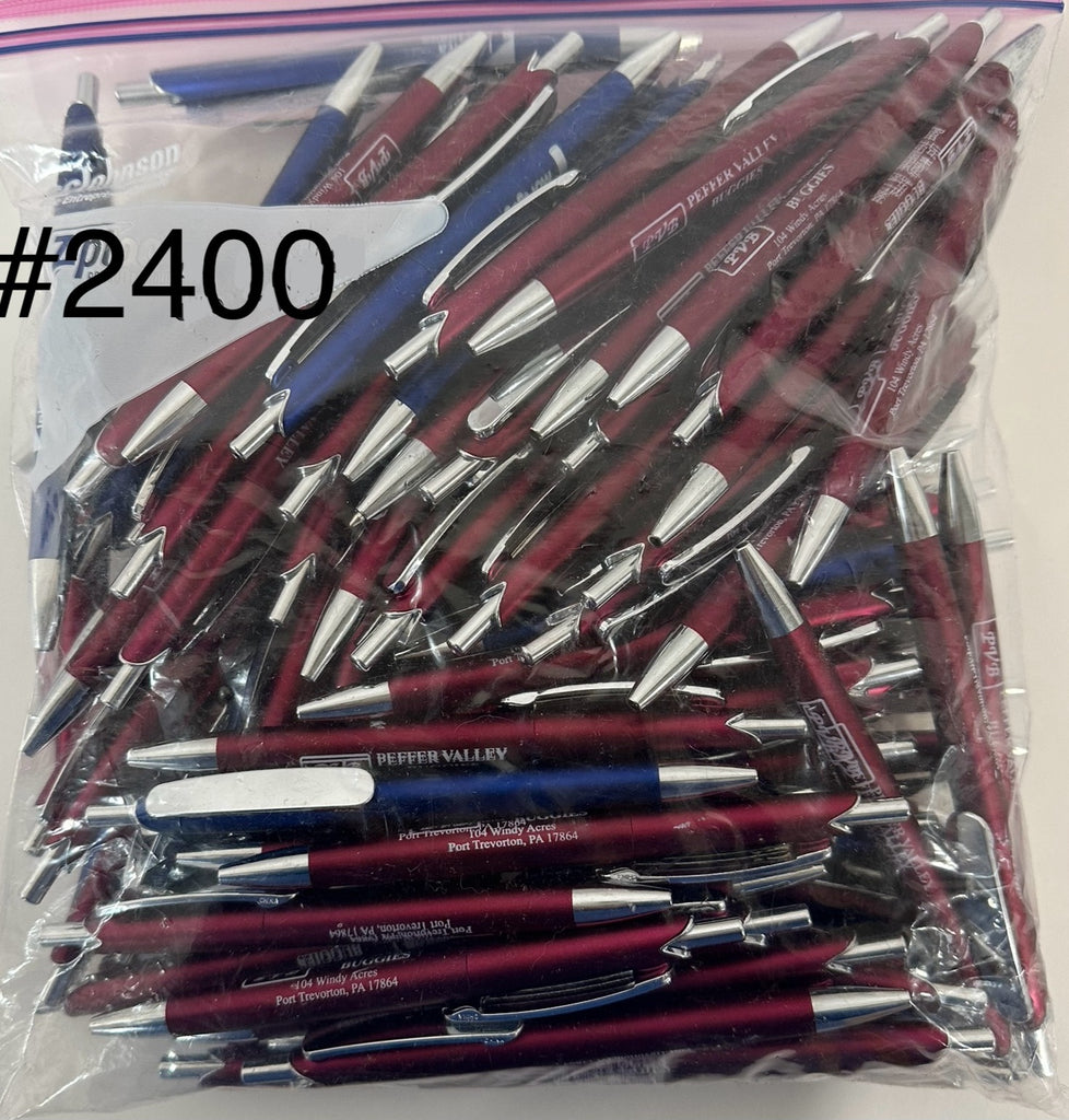 Included is a variety of retractable ballpoint pens. They are misprints from a pen printing company. The box contains approximately 80 pens.