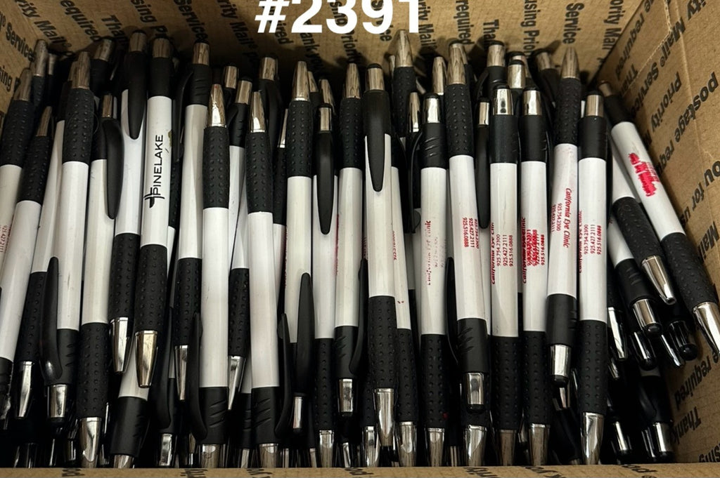 Included is a variety of retractable ballpoint pens. They are misprints from a pen printing company. The box contains approximately 190 pens.