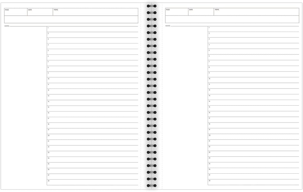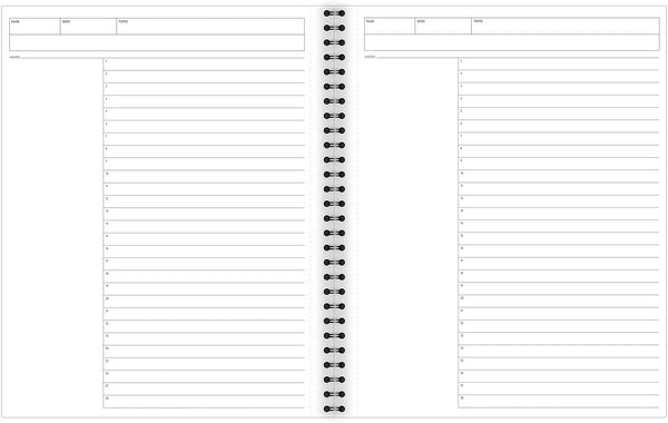 • Ruled, double-sided notebook pages keep handwriting aligned.