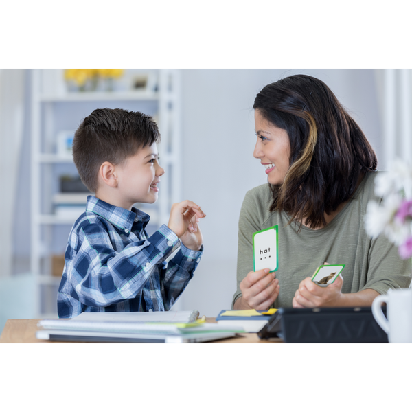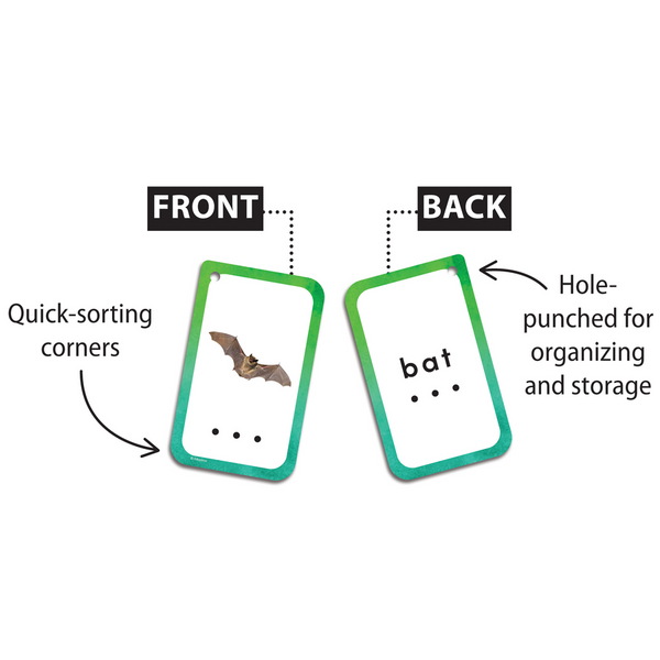 Teach and review sound buttons to help decode words individually, in groups, or with the whole class! Flash card set contains a collection of full-color, high-interest student cards as well as instructions and tips for the teacher or parent, suggested activities, and additional blank cards. Each card has a hole in the top corner that can be fit with a ring or string to help with organization and storage. Additionally, each card has one corner that is shaped differently than the others. By lining up the non-rounded corners, the flash cards can quickly be faced in the same direction. When applicable, flash card sets include answers in small print on the reverse side of each card. Each card measures 3⅛" x 5⅛". 56 double-sided cards per pack.