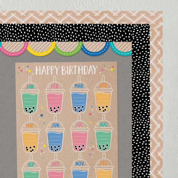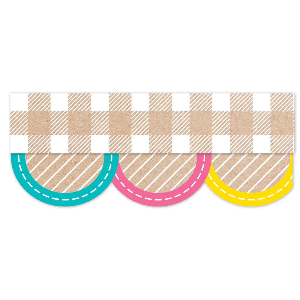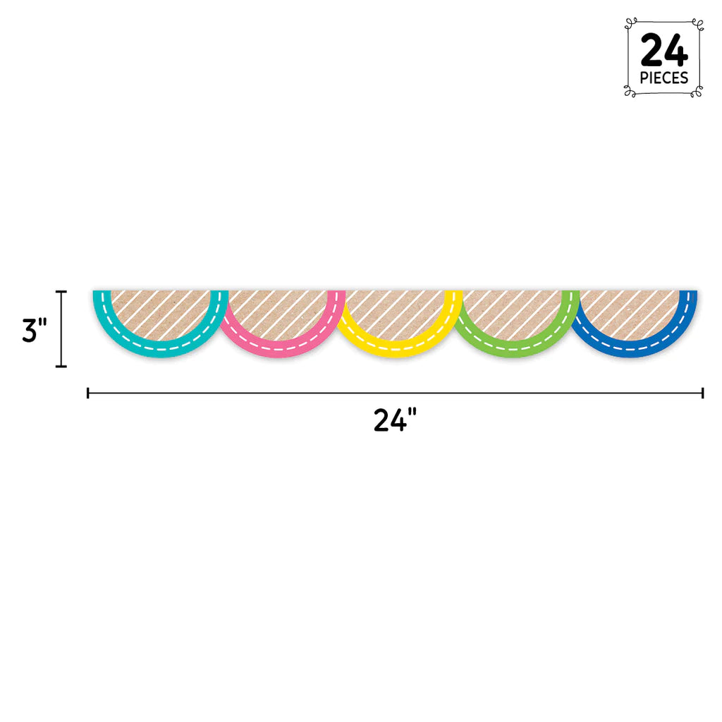 Dress up bulletin boards, rooms, hallways, and common areas with this Colorful Kraft Jumbo Scallops EZ Border. Each scallop features a stitched look on colorful edging to brighten any space. Perfect for use on bulletin boards in a wide variety of classroom, office, and school settings. These EZ borders come in smaller strips, which are easier to manage and store. Each package comes with enough borders to complete 2 full bulletin boards.