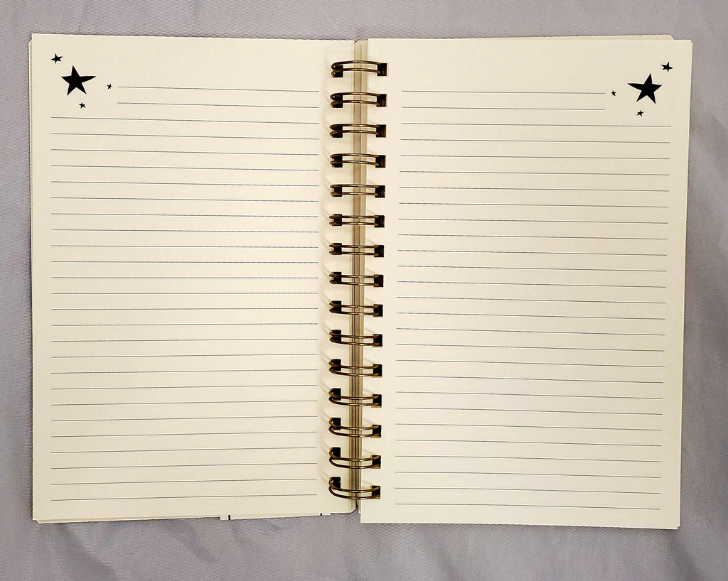 - Notebook is wirebound in gold. 5 1/2" x 8 1/2" page size.