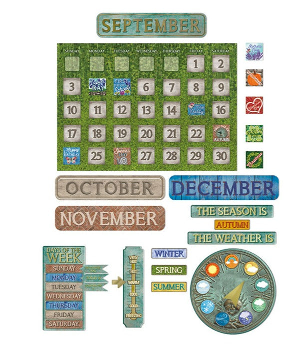 Eureka Bulletin Board Sets are a great way to add creativity to bulletin boards, hallways, walls and classroom space with fun designs and themes. Each 97 piece set includes 5 panels with: 1 giant calendar, 12 month headings, 33 dates, 37 special days, 1 days of the week chart with Today Is, Yesterday Was, and Tomorrow Is indicators, 1 temperature thermometer with indicator, a weather sundial with "The Weather Is" head and indicator, and a "The Season Is" header with seasons.