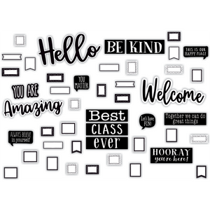 Encourage and motivate your students with this elegant bulletin board display. Includes positive sayings, inspiring words, and 32 blank framed accents. The Welcome piece measures 24½" x 10⅝". 48 pieces total.