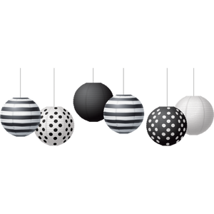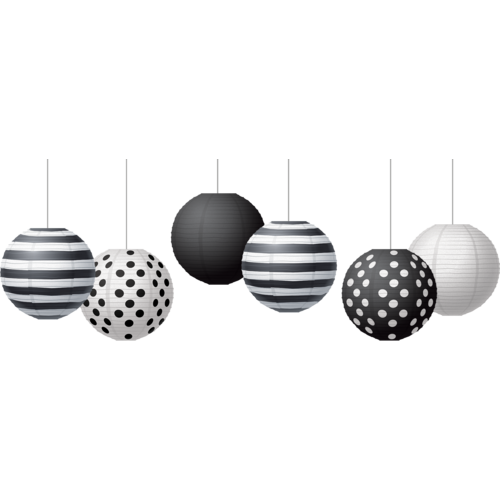 These paper lanterns are great for adding a splash of pizazz to your classroom. Coordinate with similar-patterned decoratives and popular color schemes to create the perfect look. Use them to fill up unused corners, hang accents off of them to organize work areas, or make a fun, inviting space for kids to learn. Includes 6 lanterns: one white, one black, one white with black polka dots, one black with white polka dots, two with black and white stripes. Each lantern is 8" in diameter.