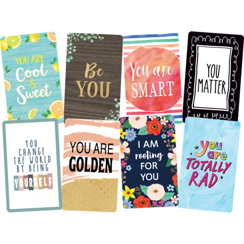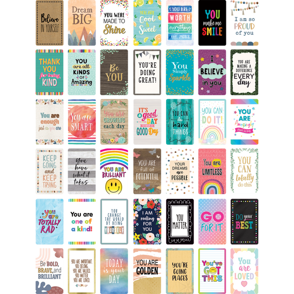 Hand out these Encouragement Cards to boost confidence, acknowledge accomplishments, or lift spirits. Each card is a positive affirmation that students can keep with them as reminders that they are cherished. Measures about 2 3/16'' x 3 1/2;''. 42 pieces per pack.