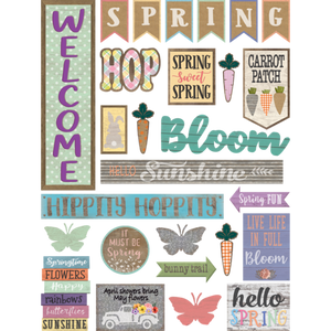 - Celebrate everything there is to love about spring with this mini bulletin board set. This farmhouse-inspired set features rustic signs with carrots, butterflies, and fun sayings in light spring colors. Largest piece measures 6" x 21". 27 total pieces.