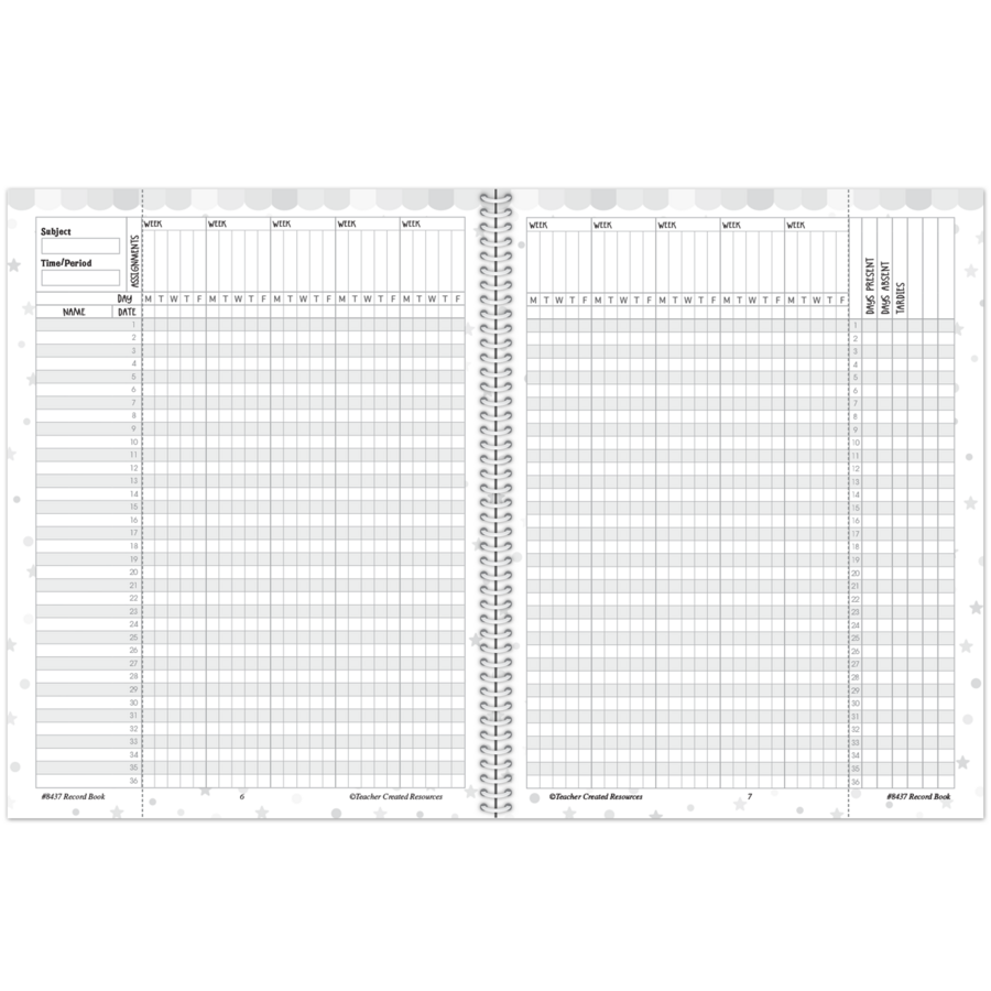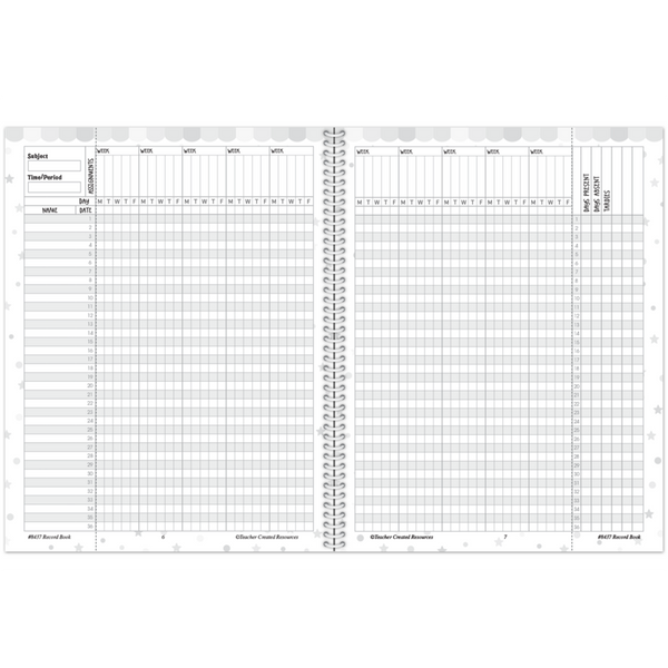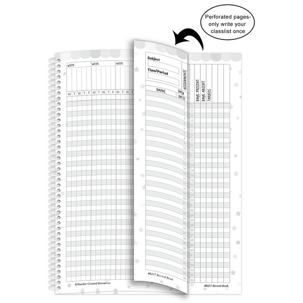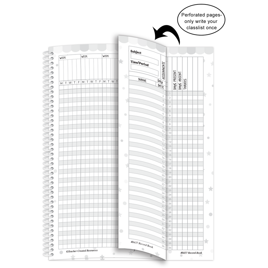 This stylish record book will add joy and inspiration to your day! Plenty of space is provided to record grades for assignments, tests, attendance, or other notations. Each two page spread allows enough space for 10 weeks worth of record keeping. Convenient, perforated pages allow for easy management of larger classes. An easy-to-use grading chart is also provided.