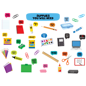 These visual representations of commonly used classroom supplies are not only cute addition to add to your decor,they can be used to keep students on track. Display them ear stations year-round or pull selected pieces to show your class the items needed to complete specific projects. Header piece measures 18⅞'' x 4⅜''. 45 total pieces.